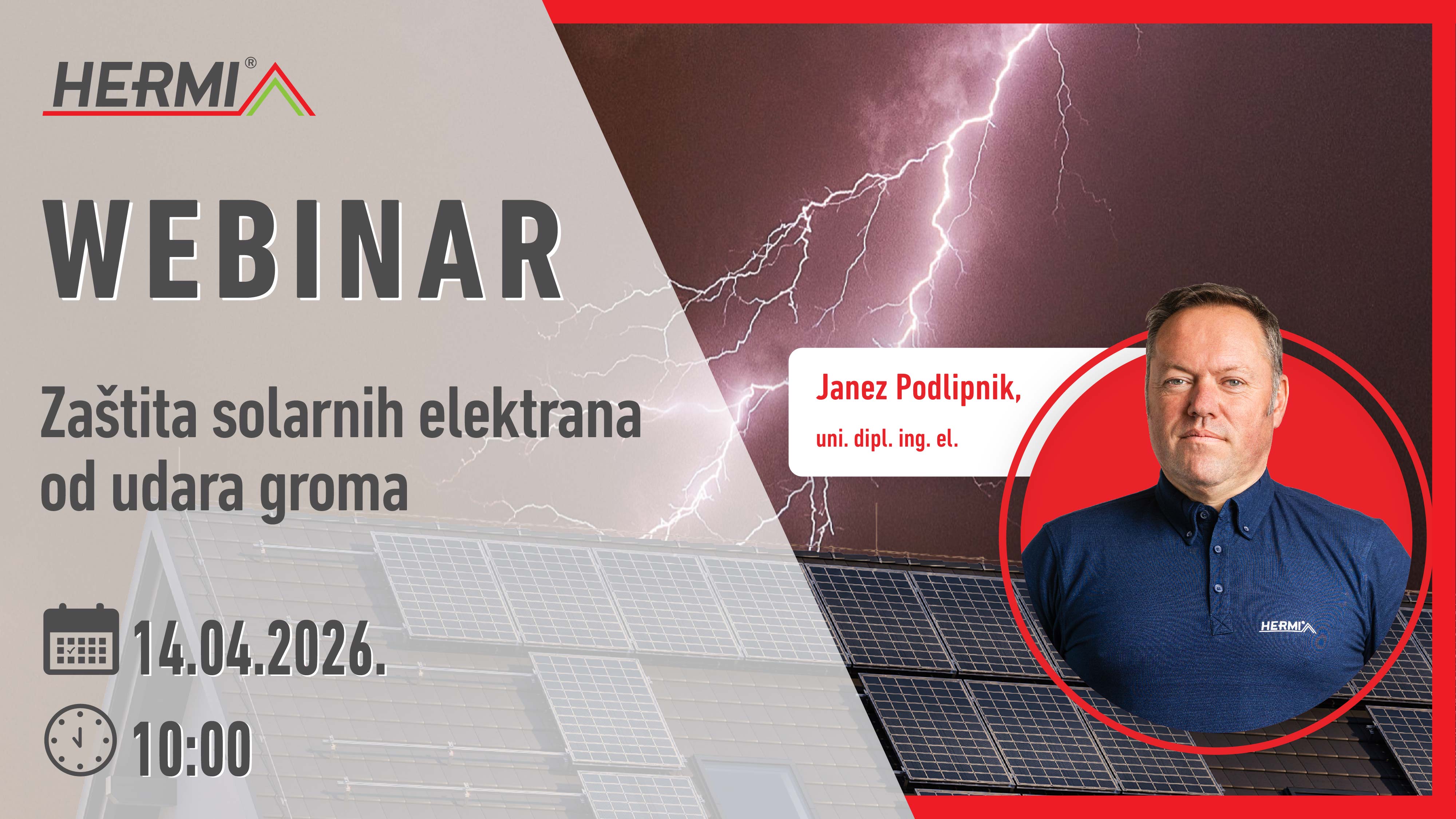 Zbog sve večeg korištenja obnovljivih izvora energije povečava se i broj solarnih elektrana. Često se zaboravlja na odgovarajuću zaštitu od munja i prenapona. Na webinaru ćemo predstaviti ključne segmente zaštite sa Hermi komponentama, koje osiguravaju siguran i dugotrajan rad solarnih elektrana.